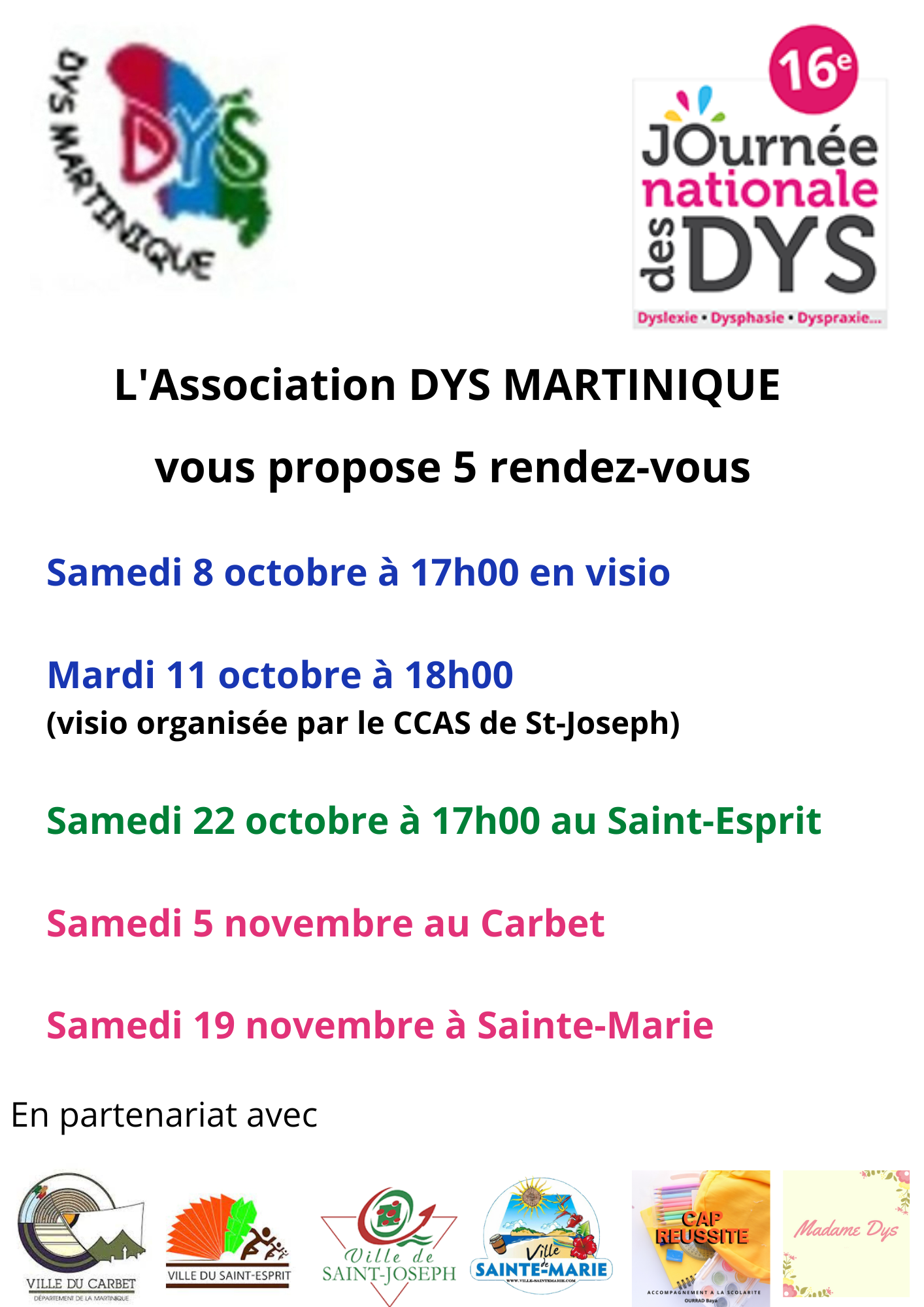 Depuis 2014, l’association d’adultes et de parents d’enfants atteints de troubles du langage et des apprentissages de la Martinique informe et sensibilise sur les troubles des apprentissages. Ateliers pour ses adhérents et leurs enfants, réunions dans les établissements scolaires, conférences-débats dans le cadre des dispositifs de soutien à la parentalité, l’association DYS MARTINIQUE tente de répondre à vos attentes, ou du moins réfléchir à des pistes de solutions.